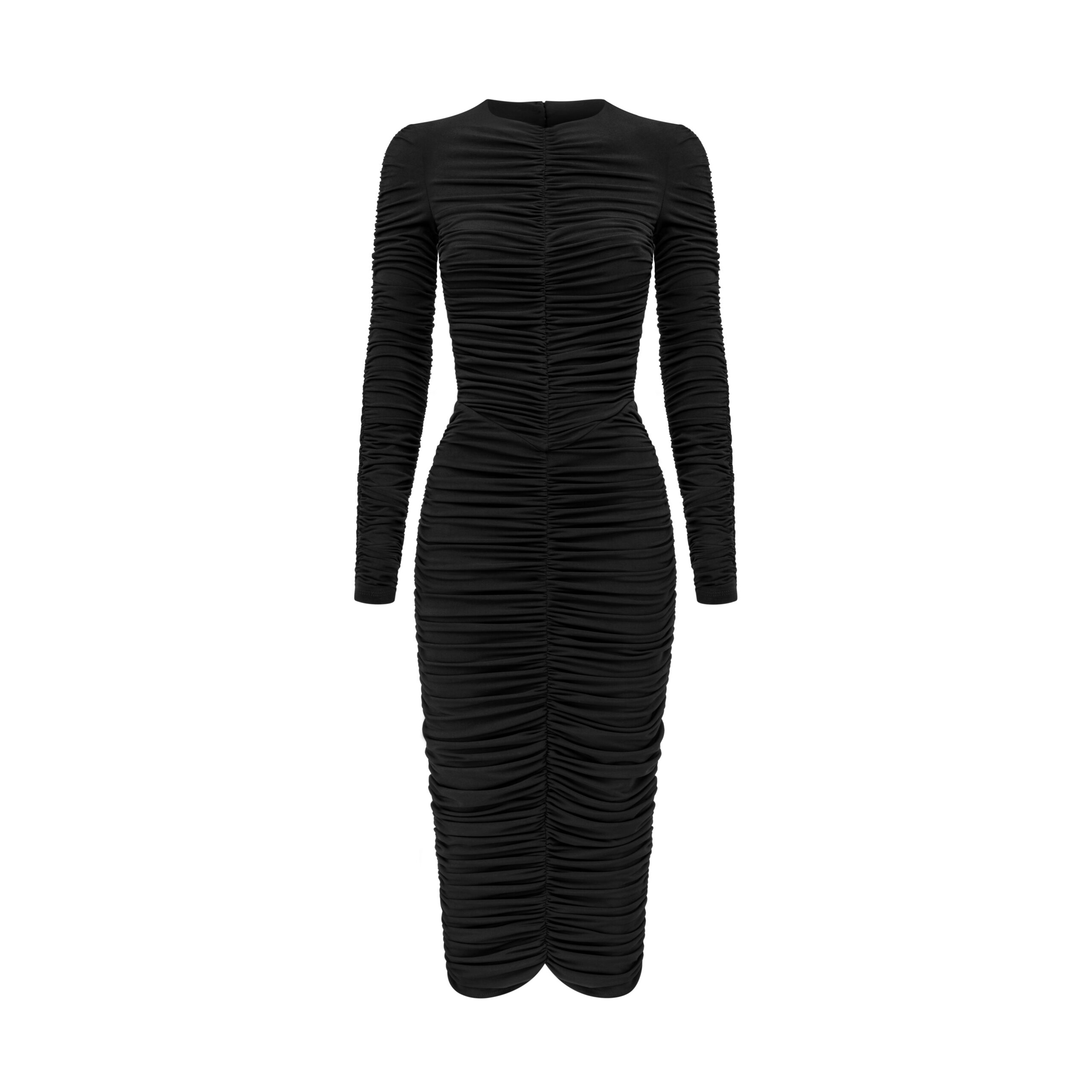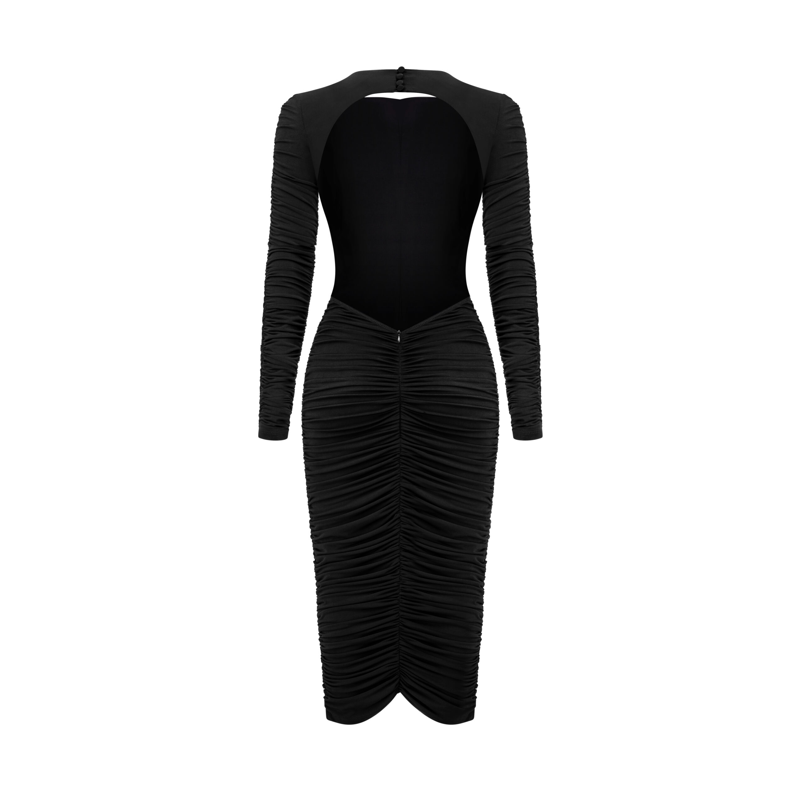The Casablanca dress is a midi-length style with a distinctive cut that highlights the lines of the silhouette. Decorative fabric ruching and an open back add a striking, eye-catching character. It features long sleeves and a classic neckline, while the stretchy fabric ensures comfort and ease of movement.