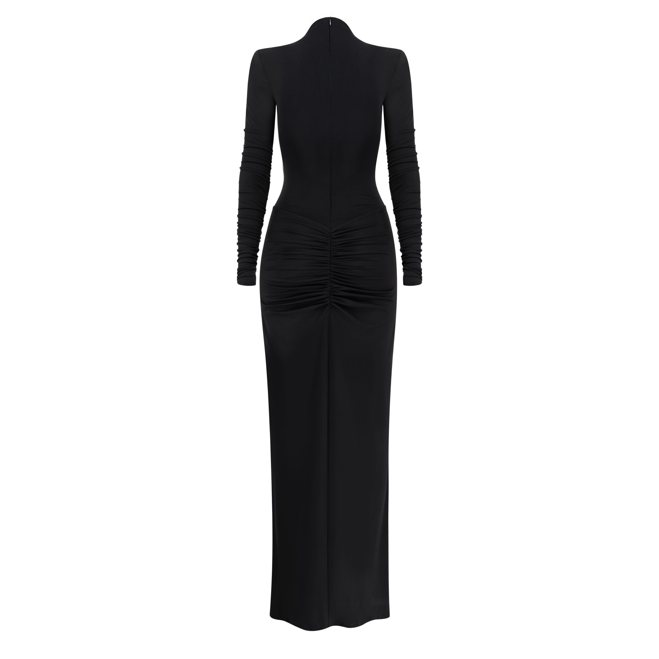 Fitted maxi dress with long sleeves and shoulder pads in burgundy. Perfect for special occasions.