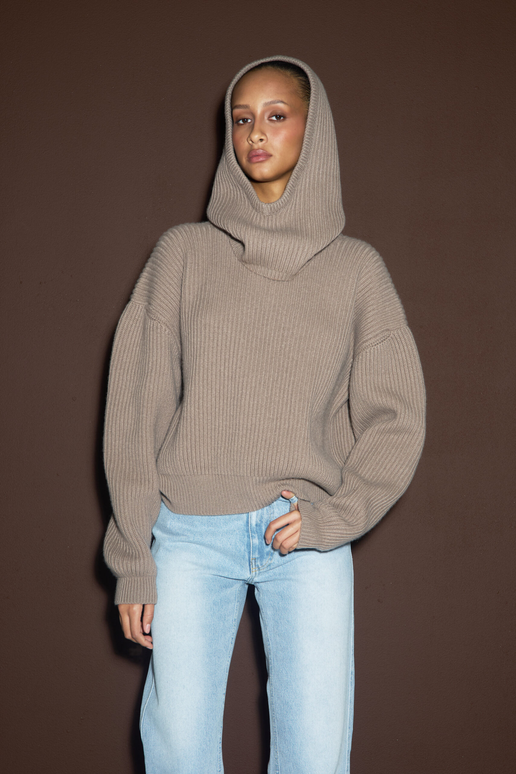 Balaclava w kolorze taupe. Wykonana z delikatnej, miękkiej dzianiny idealnie dopełni każdą zimową stylizację.