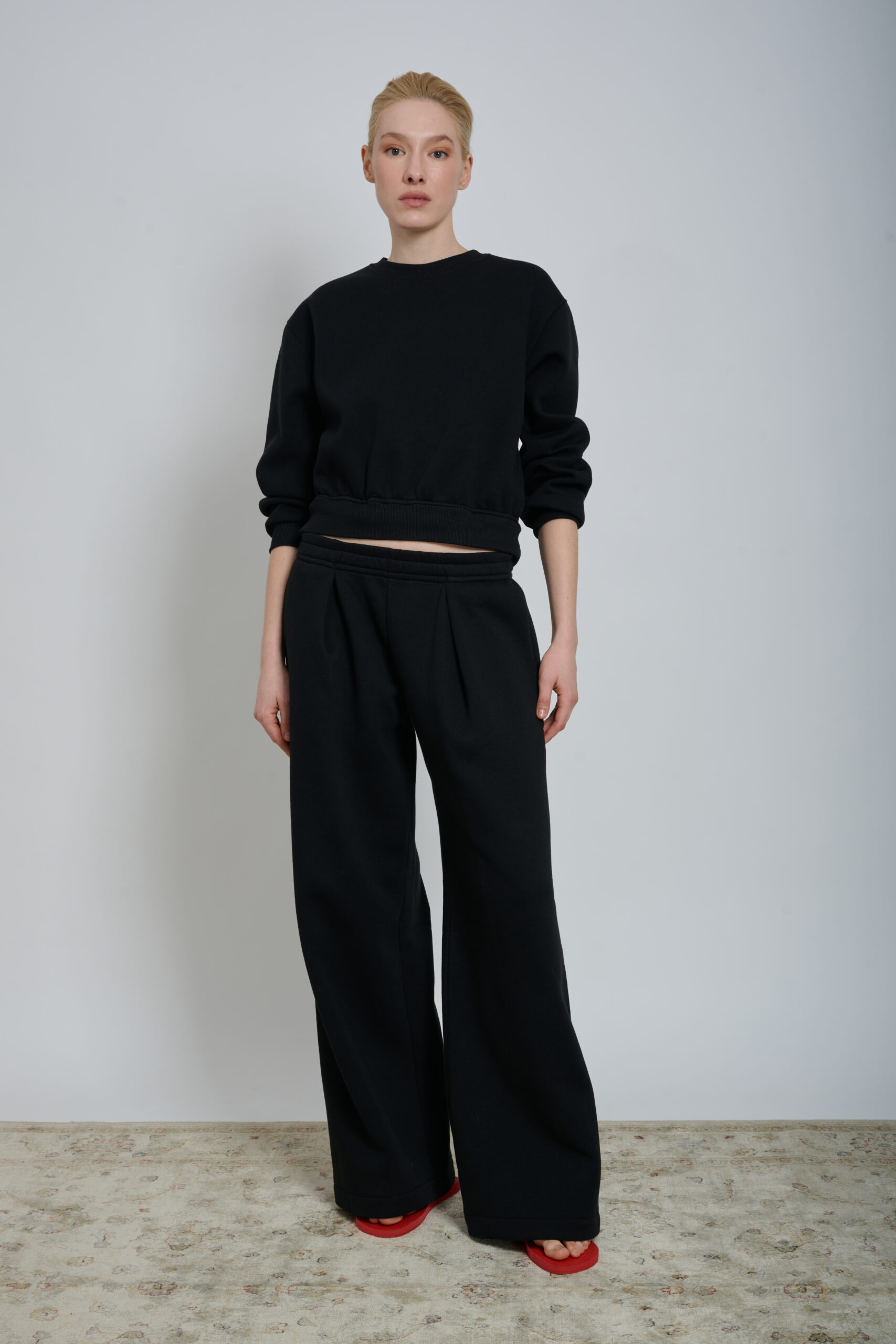 Wide-leg pants with an elastic waistband and pleats, ensuring comfort and freedom of movement.