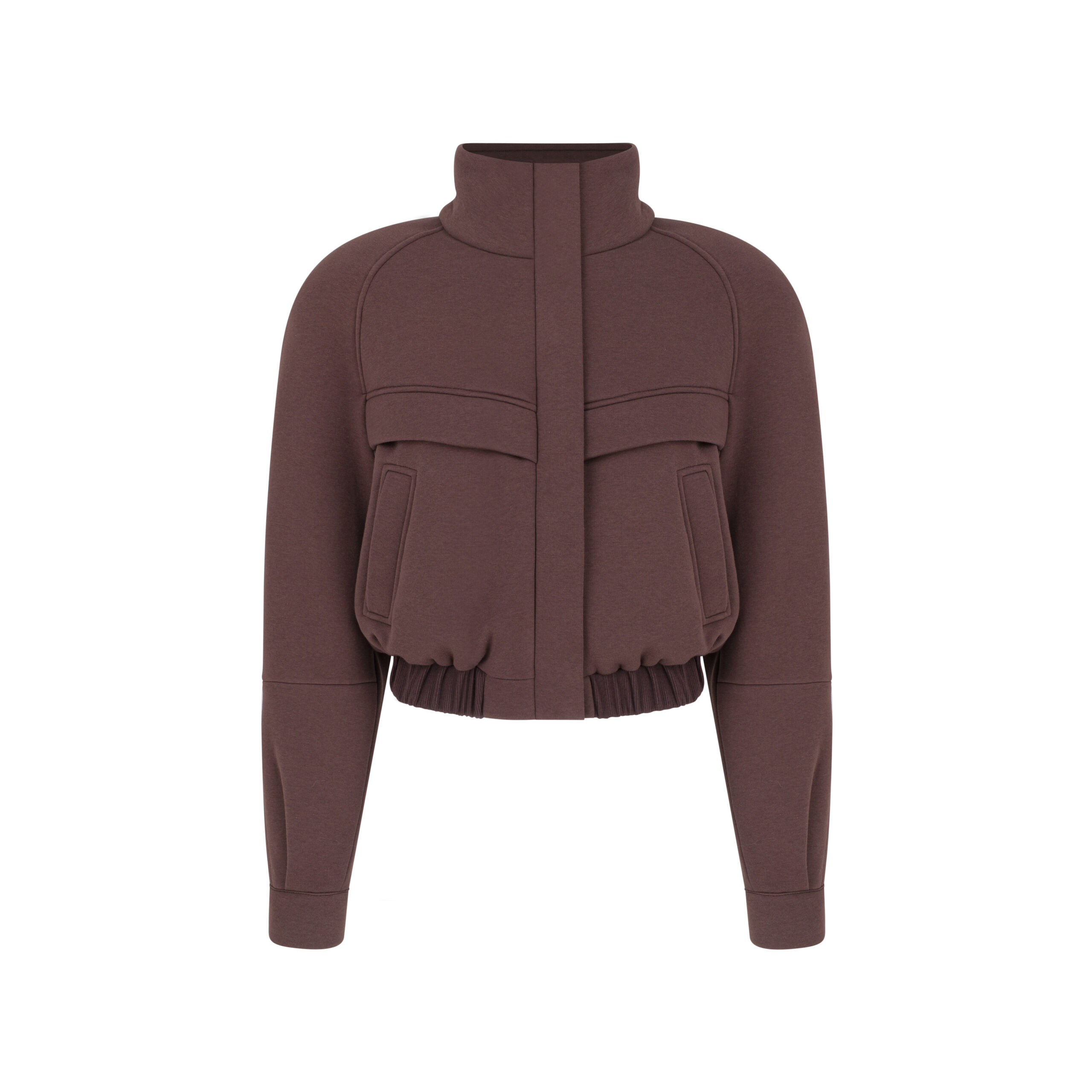 Oversized jacket with rounded shoulder pads in brown.