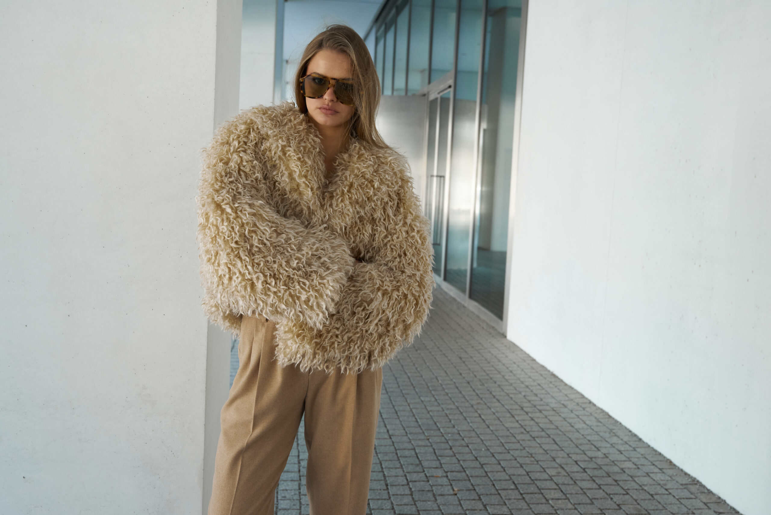 Krótkie futro o oversizowym kroju, wykonane z lekkiego materiału w kolorze brązowym. Posiada szerokie rękawy i zapięcie na wysokości talii. Idealne do stylizacji zarówno codziennych, jak i wieczorowych.