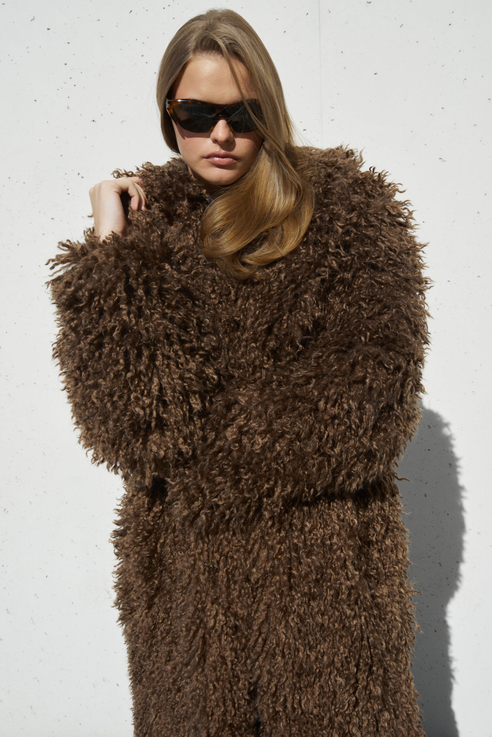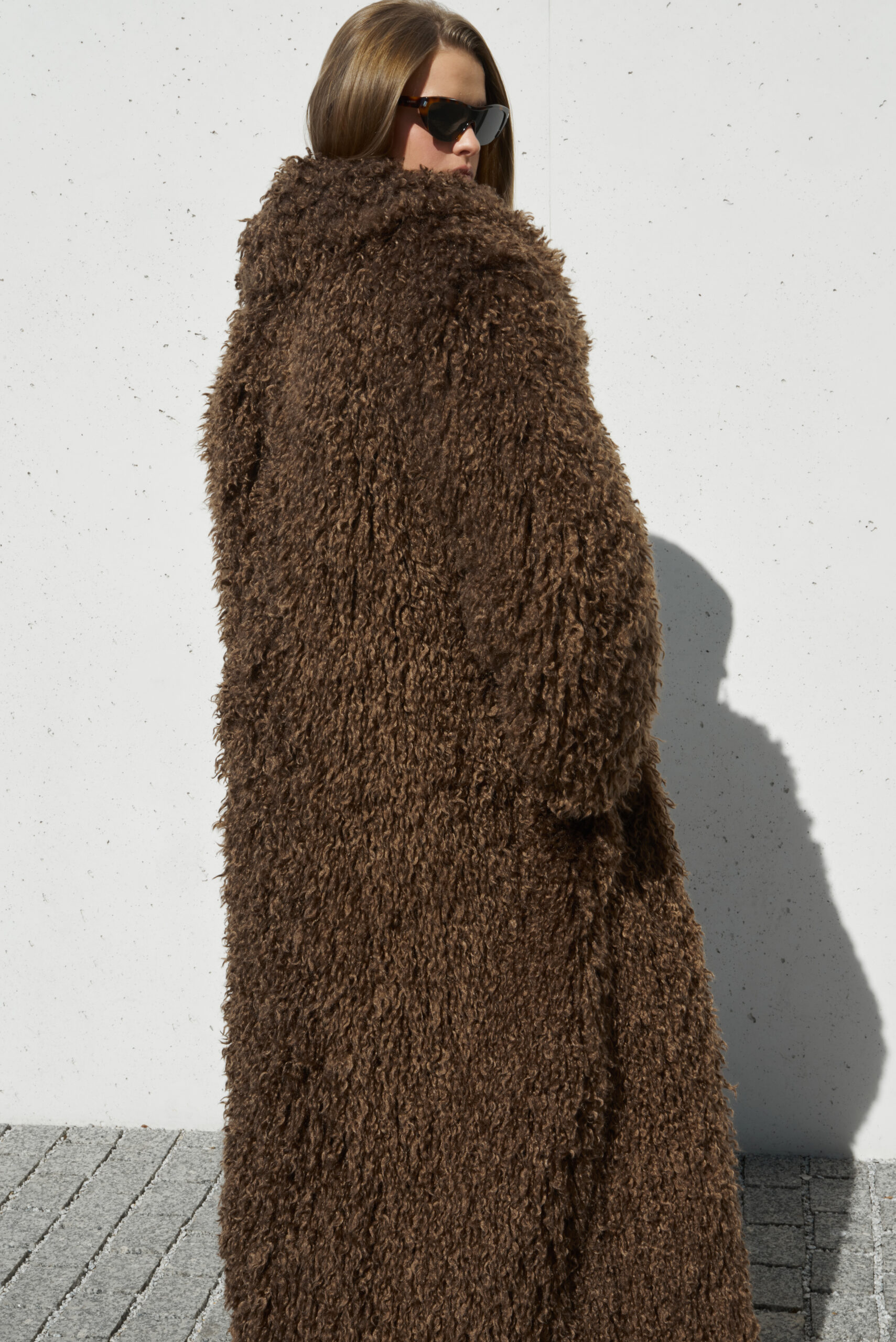 Długie futro o oversizowym kroju, wykonane z lekkiego materiału w kolorze brązowym. Posiada szerokie rękawy i zapięcie na wysokości talii. Idealne do stylizacji zarówno codziennych, jak i wieczorowych.