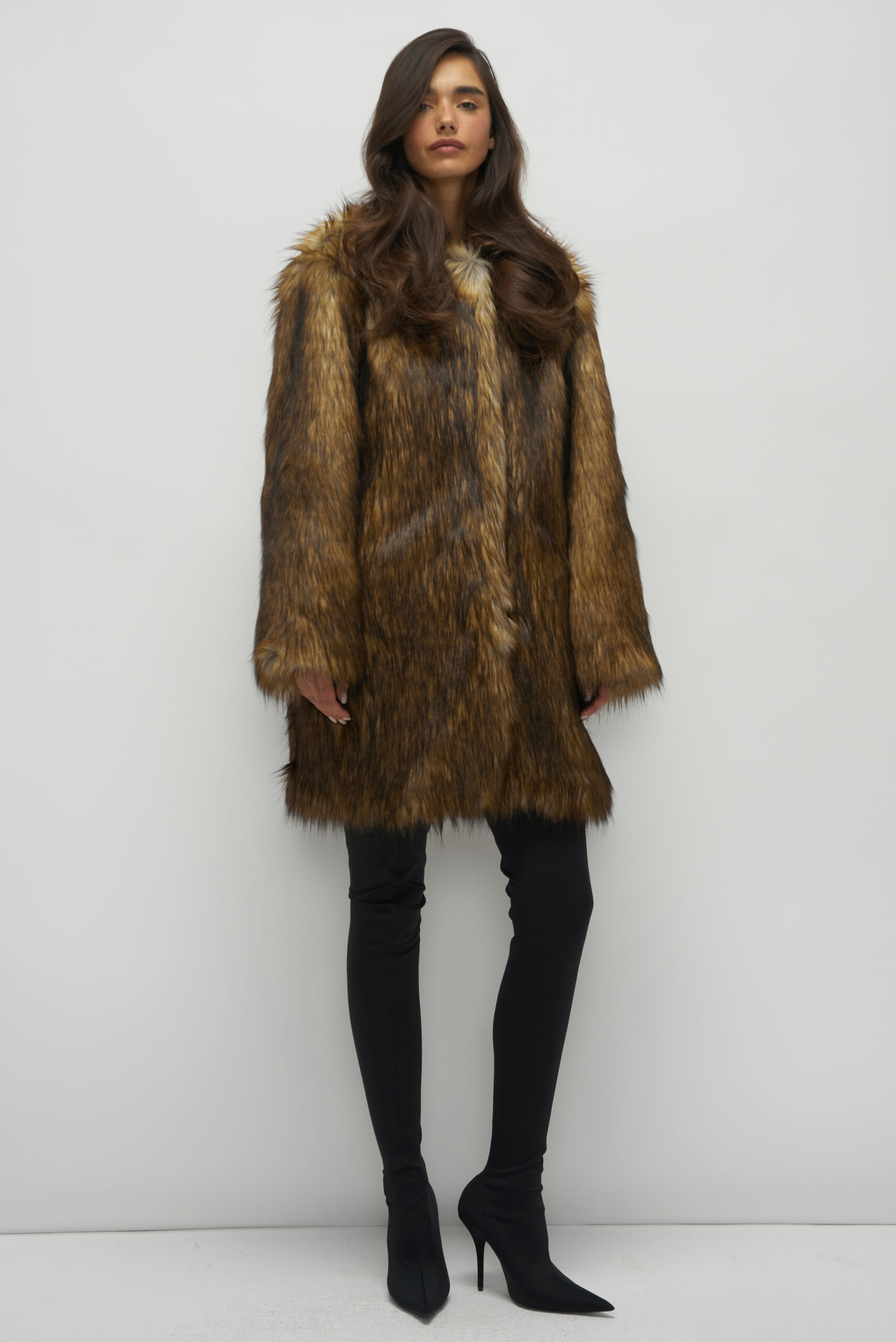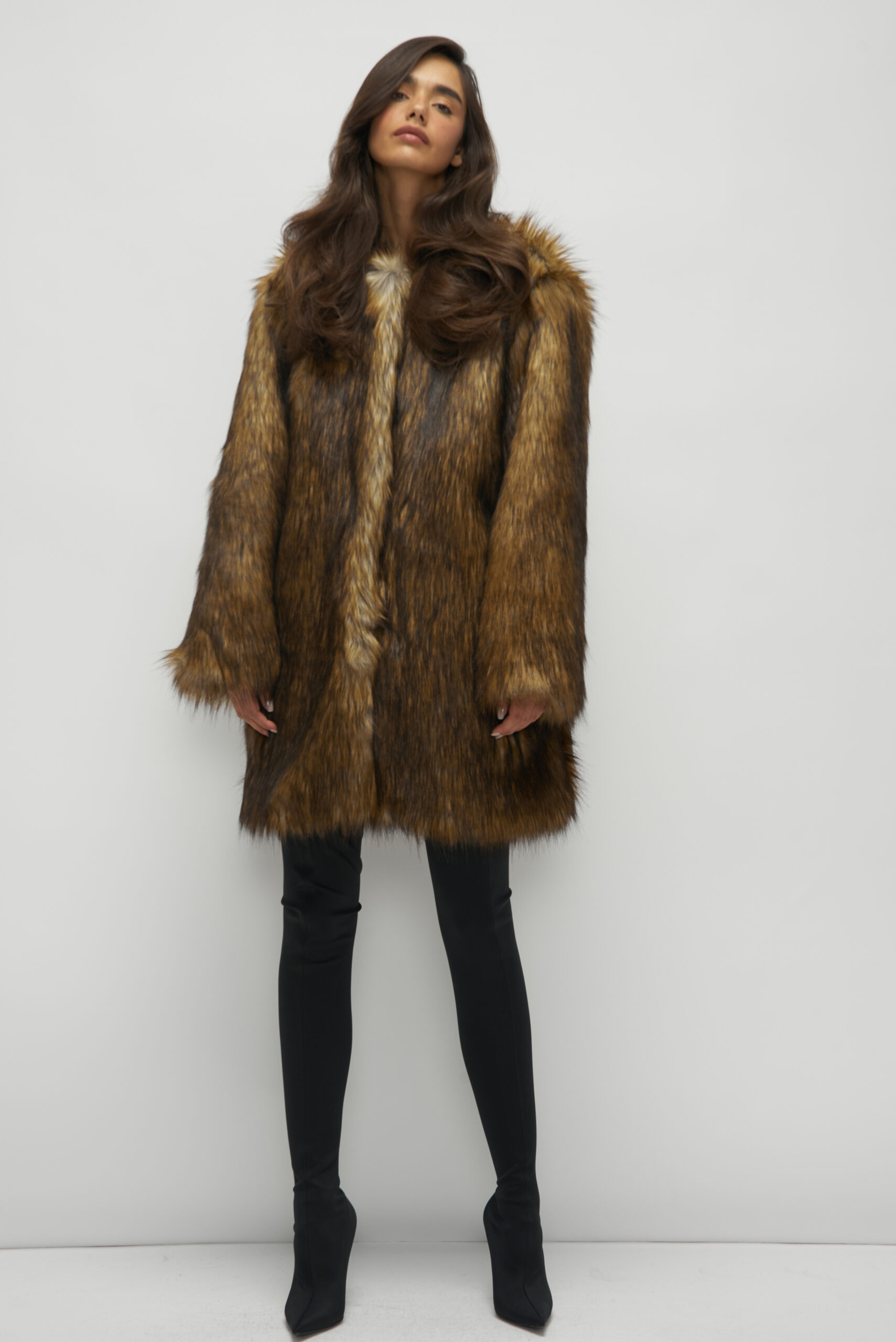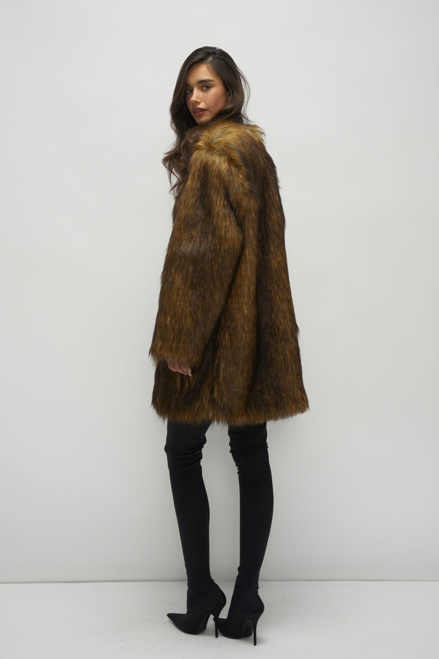 Futro o pudełkowym kroju wykonane ze sztucznego futra w kolorze jasnego brązu. Posiada zapięcia na haftki. Podszewka wykonana z wiskozy w kolorze bordowym.
