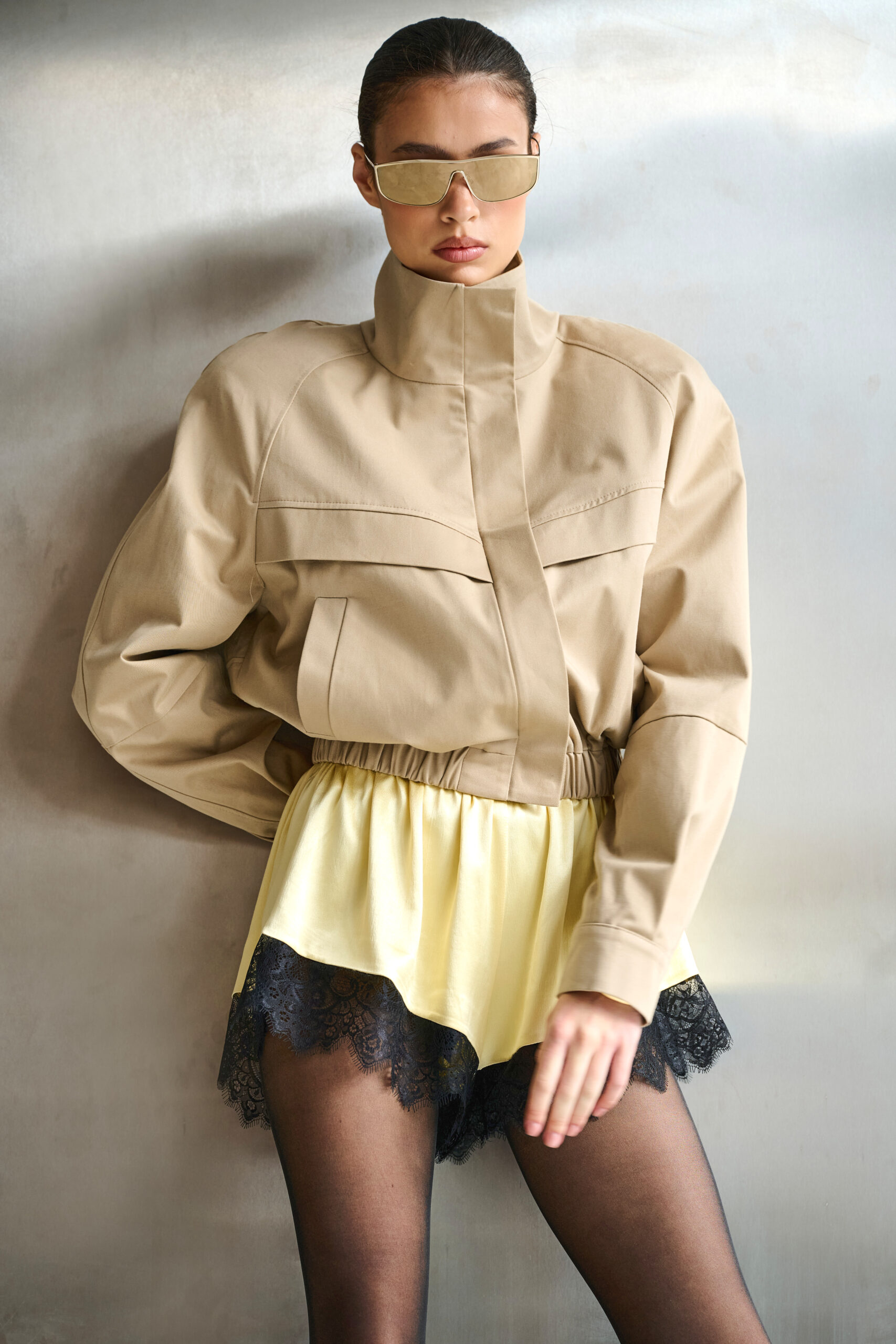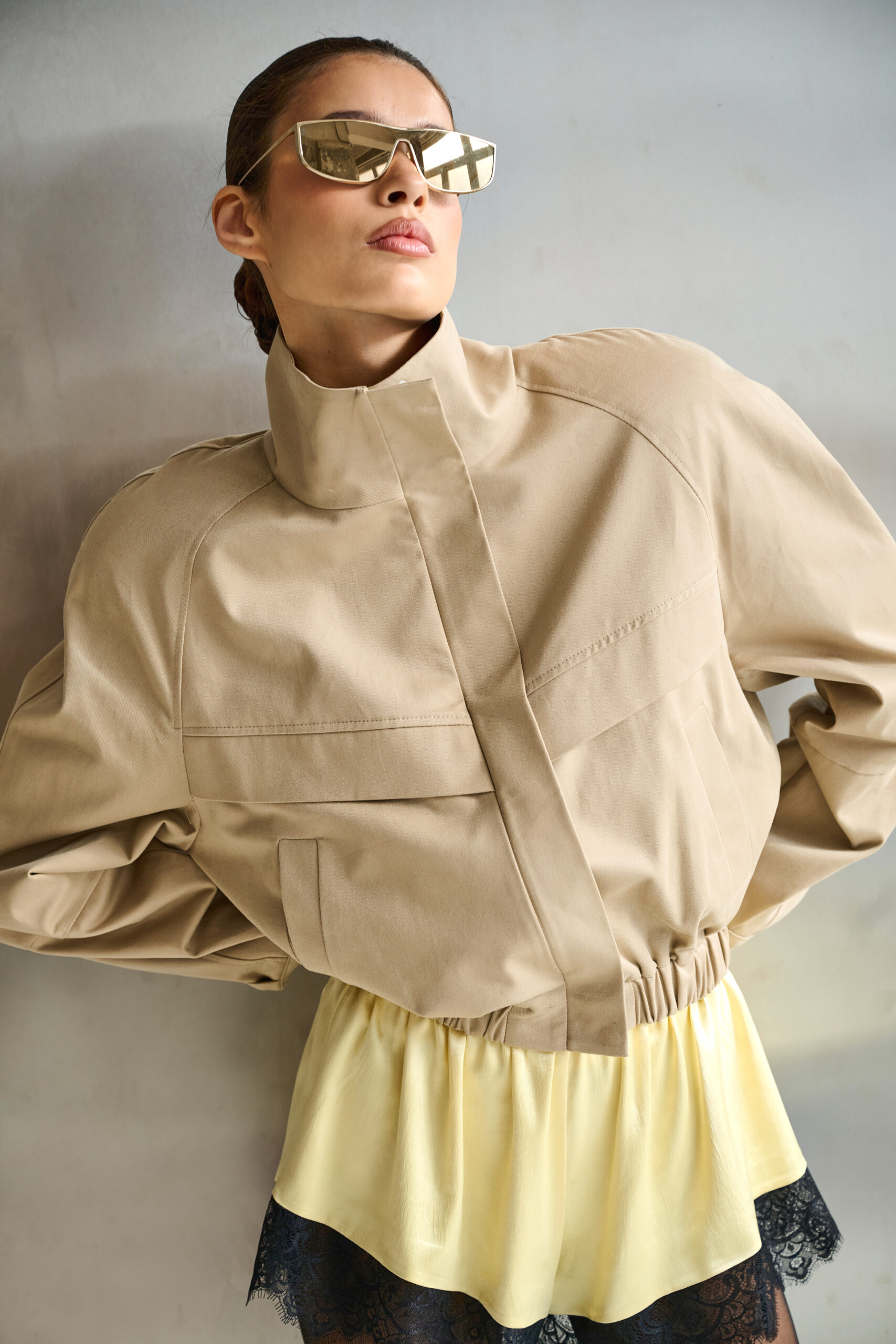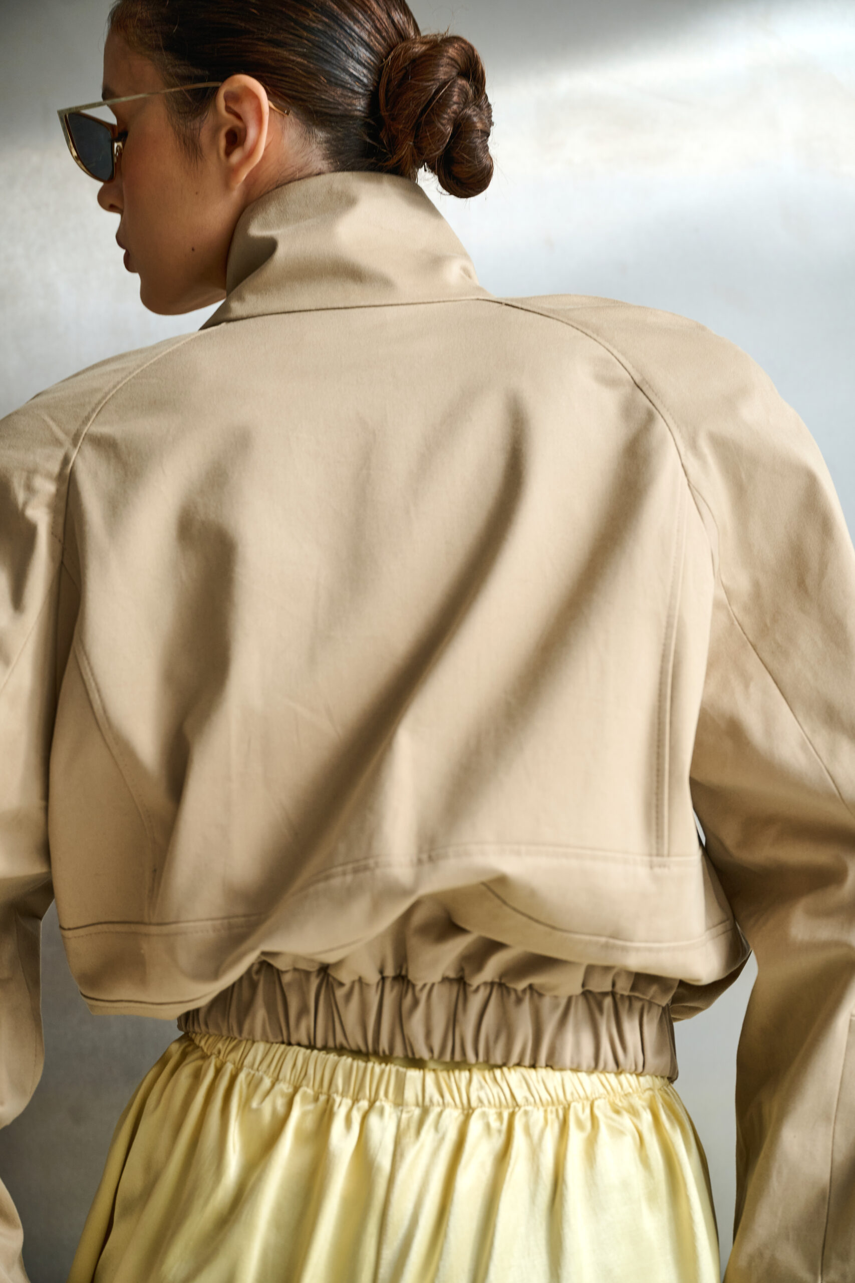 Kurtka o oversizowym kroju z poduszkami na ramionach o zaokrąglonym kształcie w kolorze beżowym.