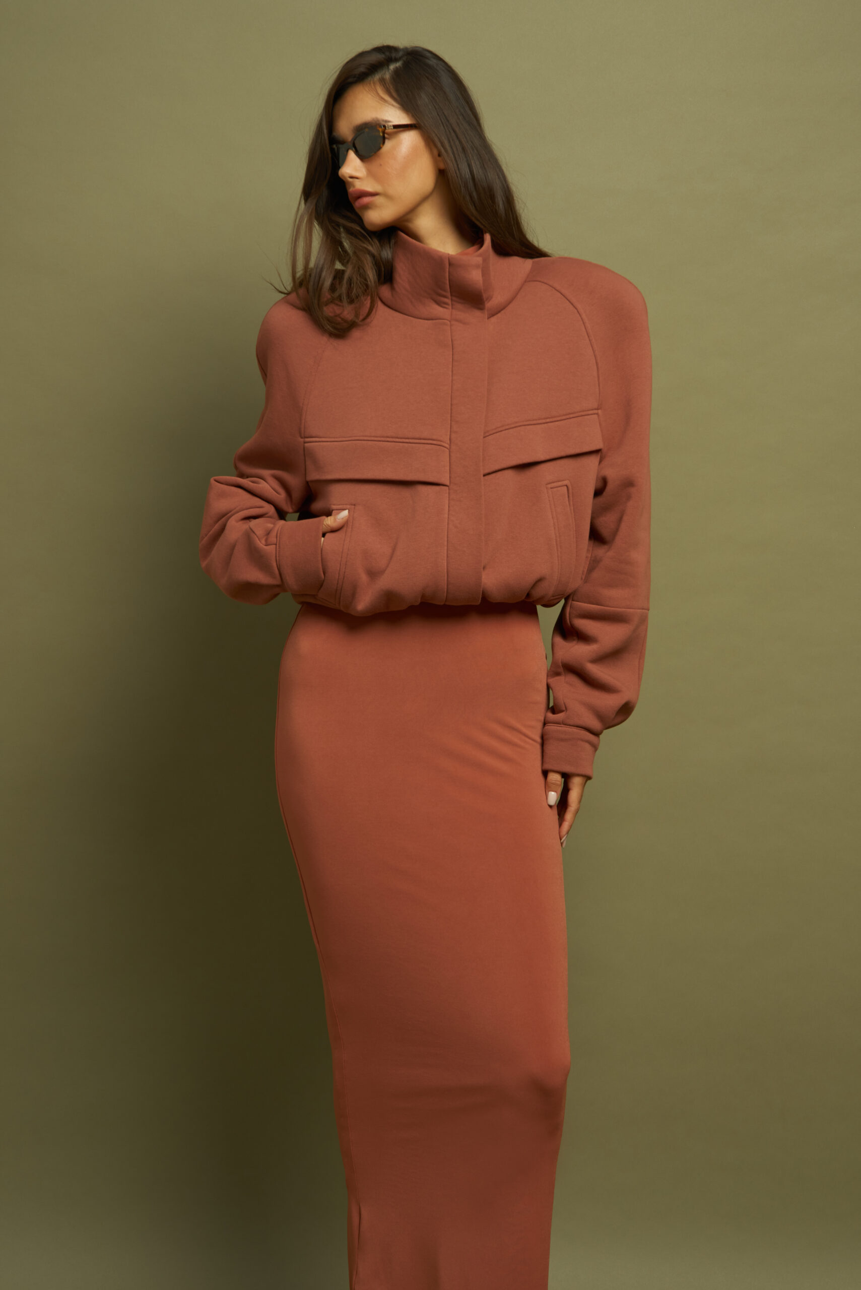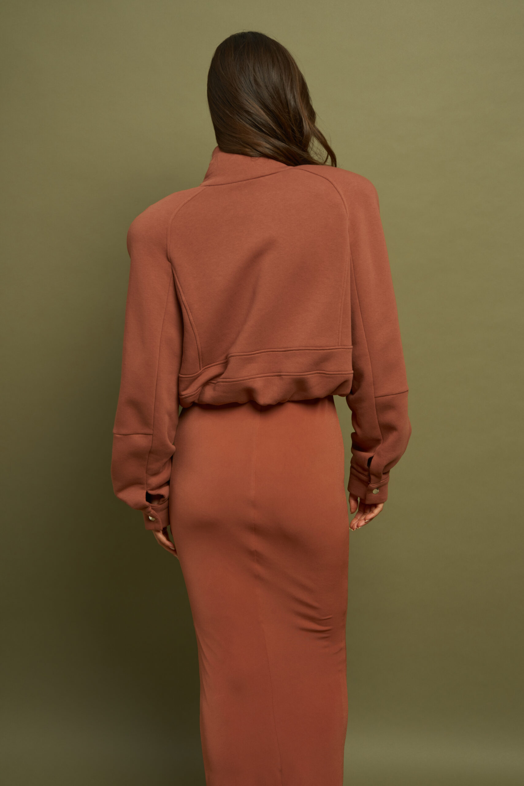 Kurtka o oversizowym kroju z poduszkami na ramionach o zaokrąglonym kształcie w kolorze koniakowym.