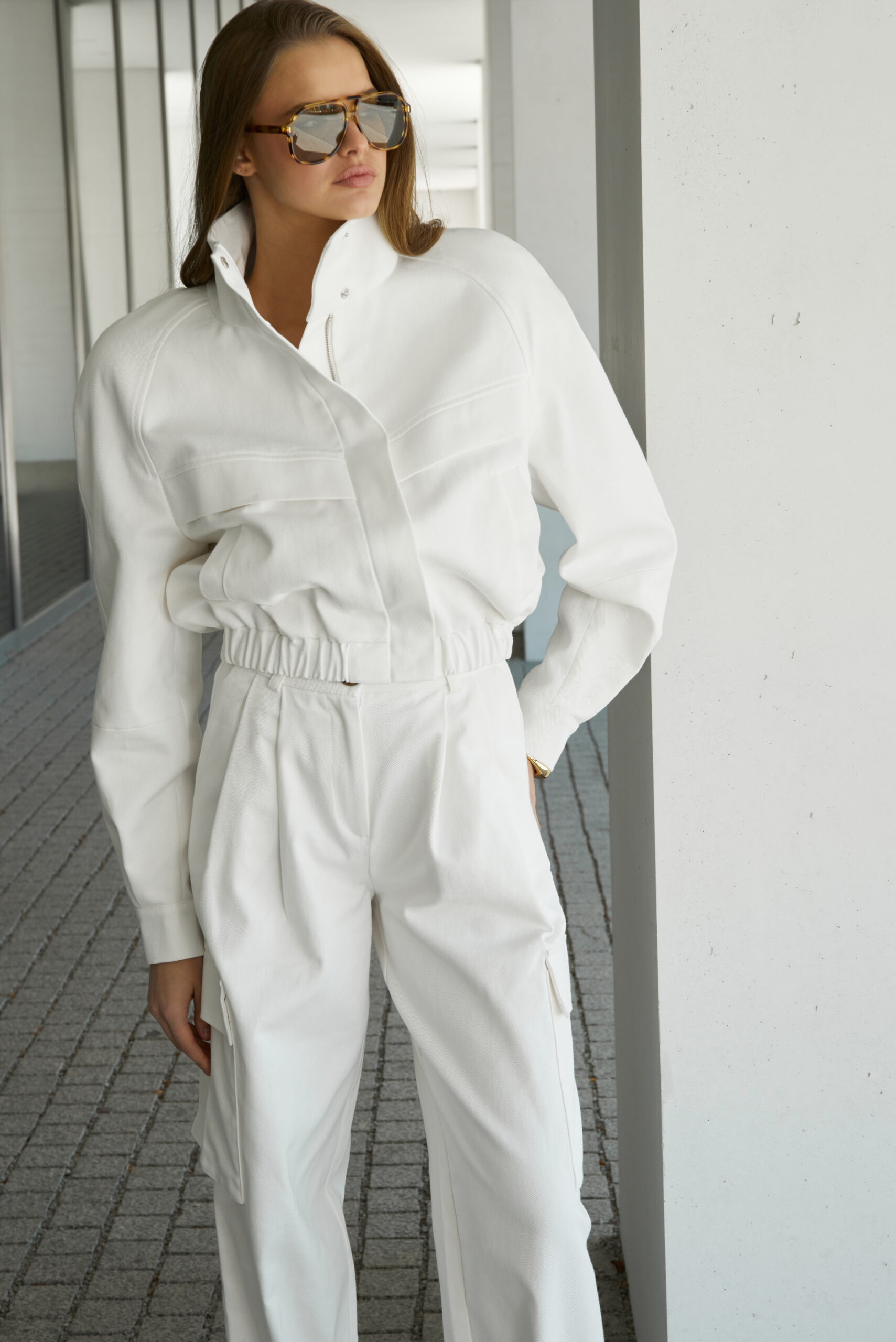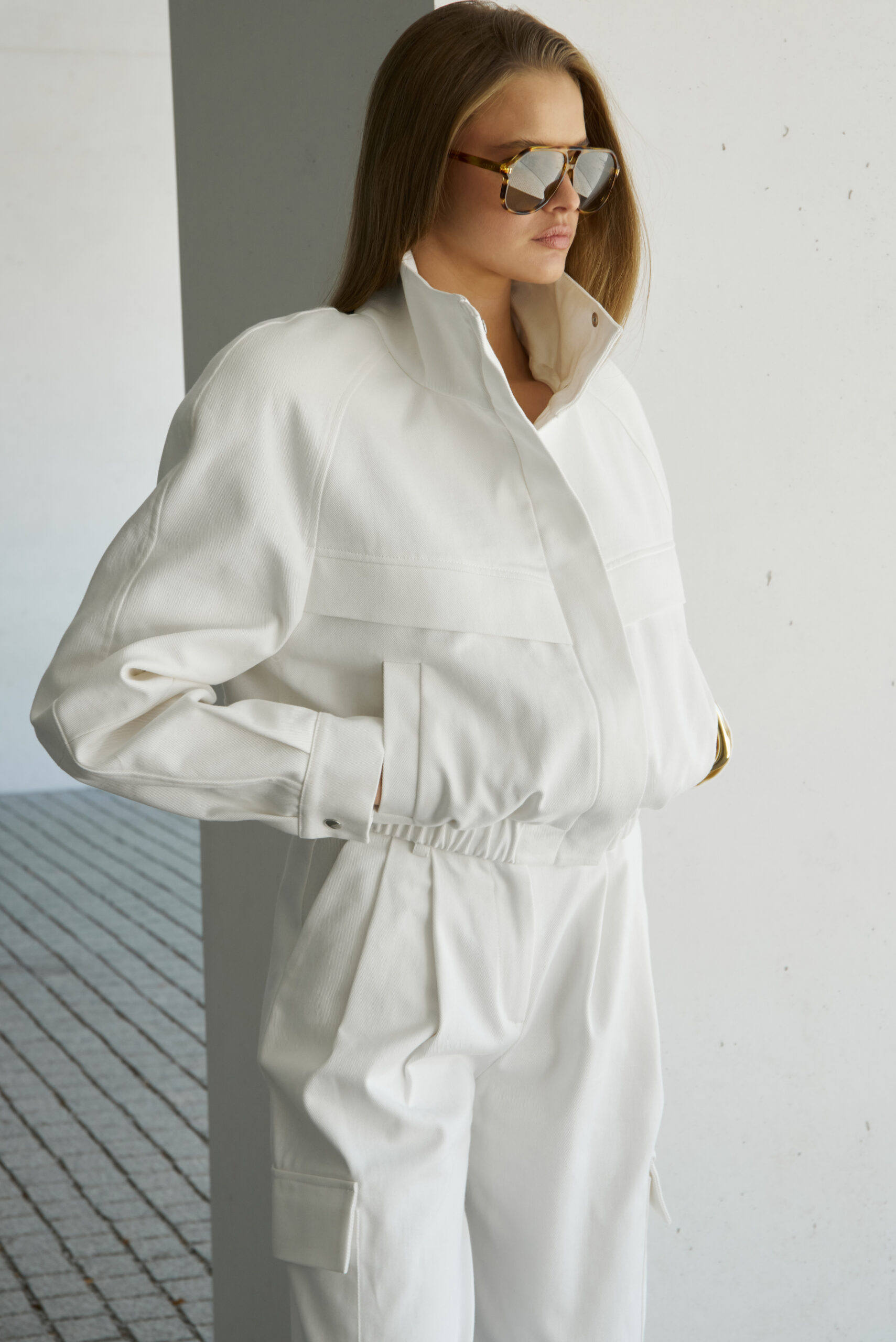 Kurtka o oversizowym kroju z poduszkami na ramionach o zaokrąglonym kształcie w kolorze kremowym.