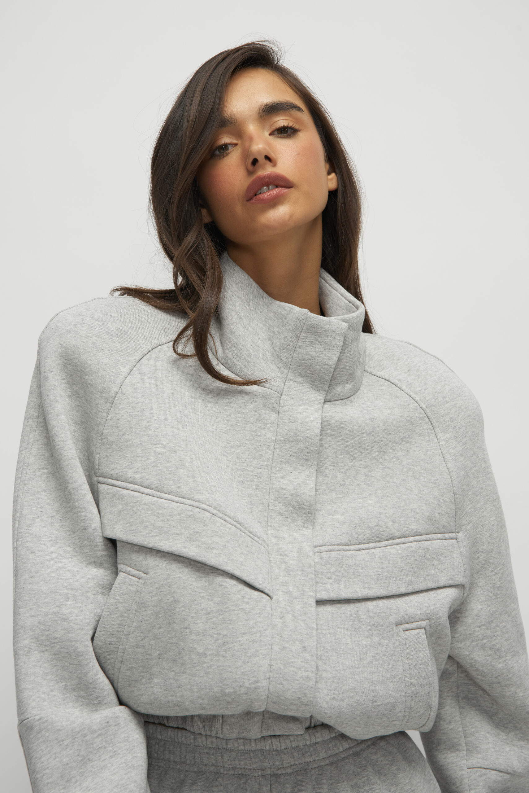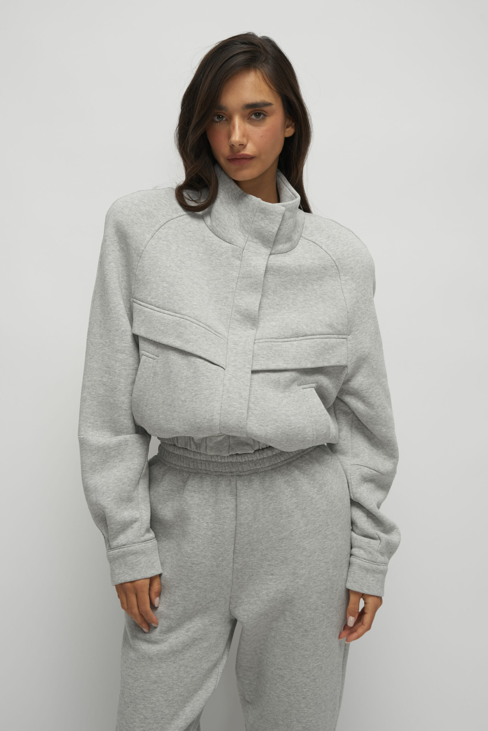 Kurtka o oversizowym kroju z poduszkami na ramionach o zaokrąglonym kształcie w kolorze szarym.