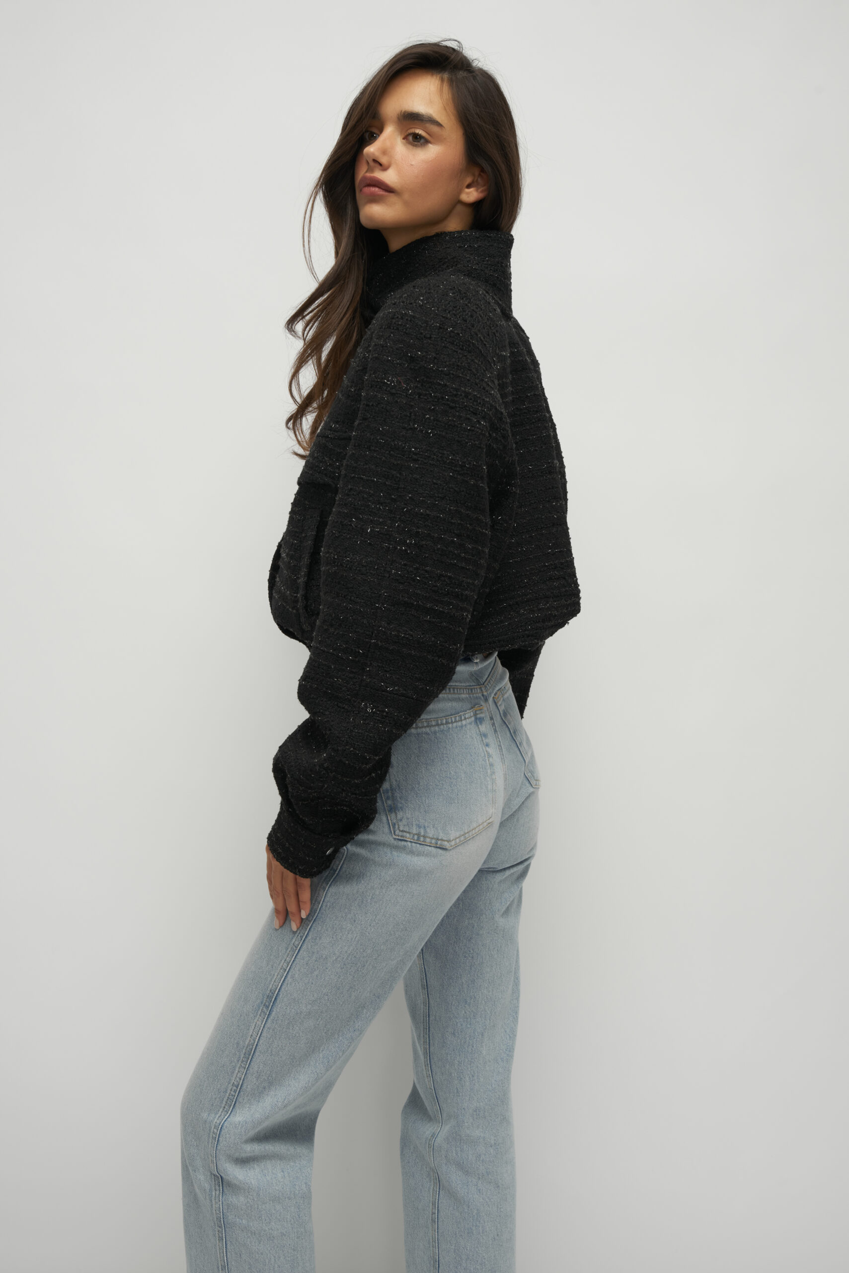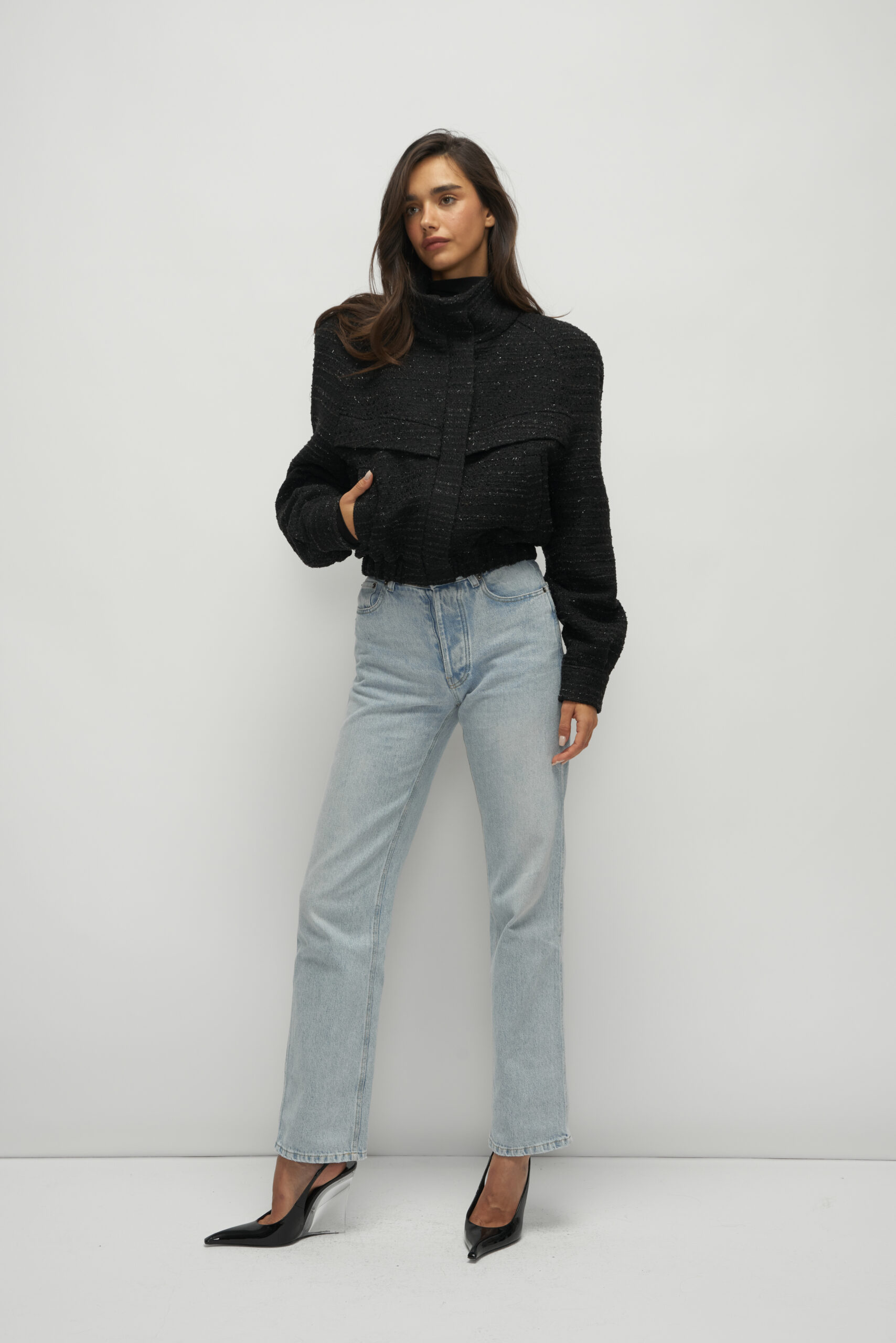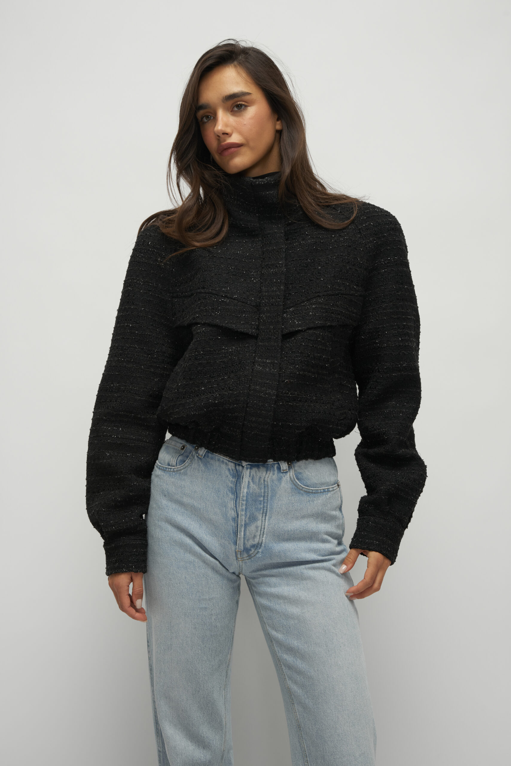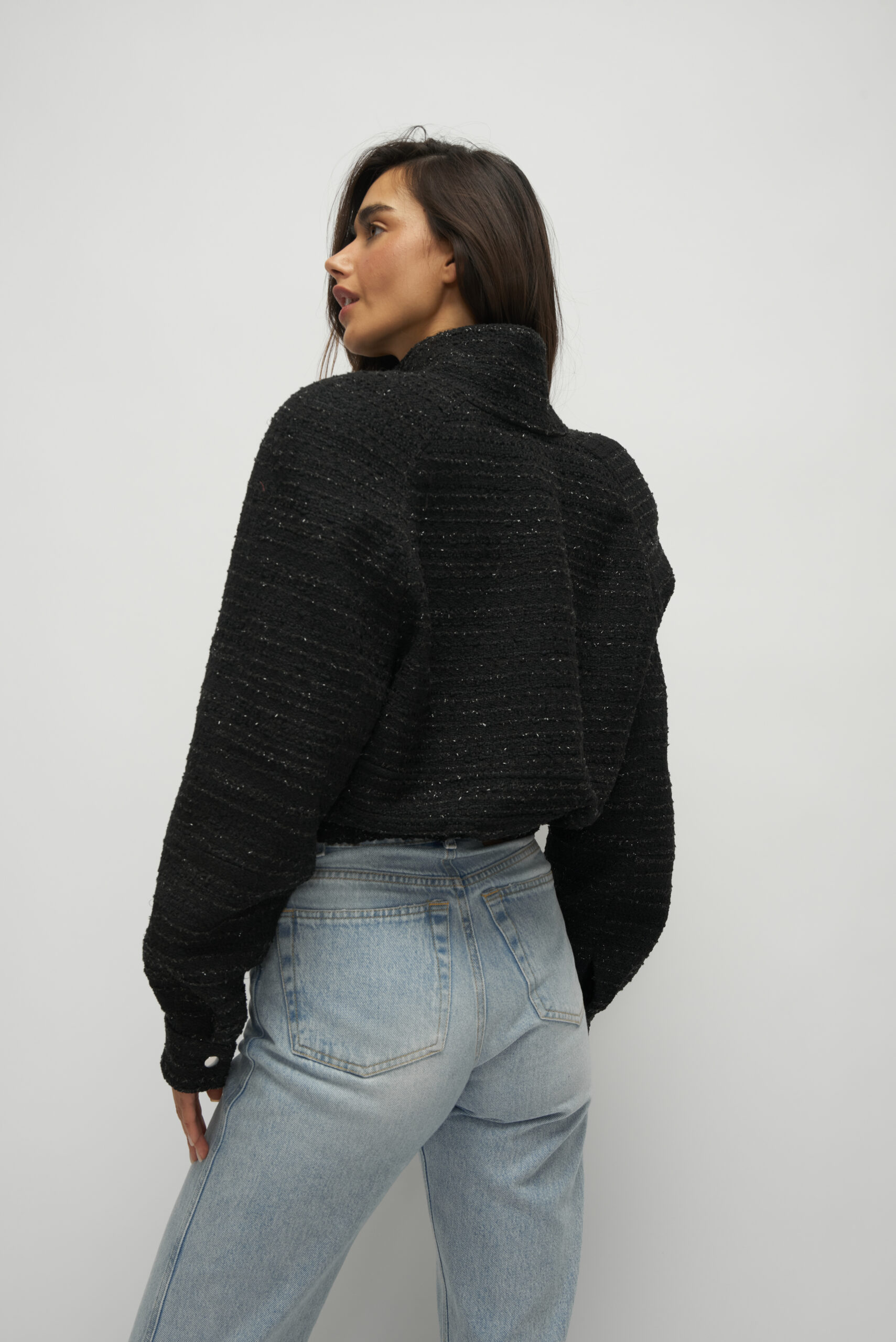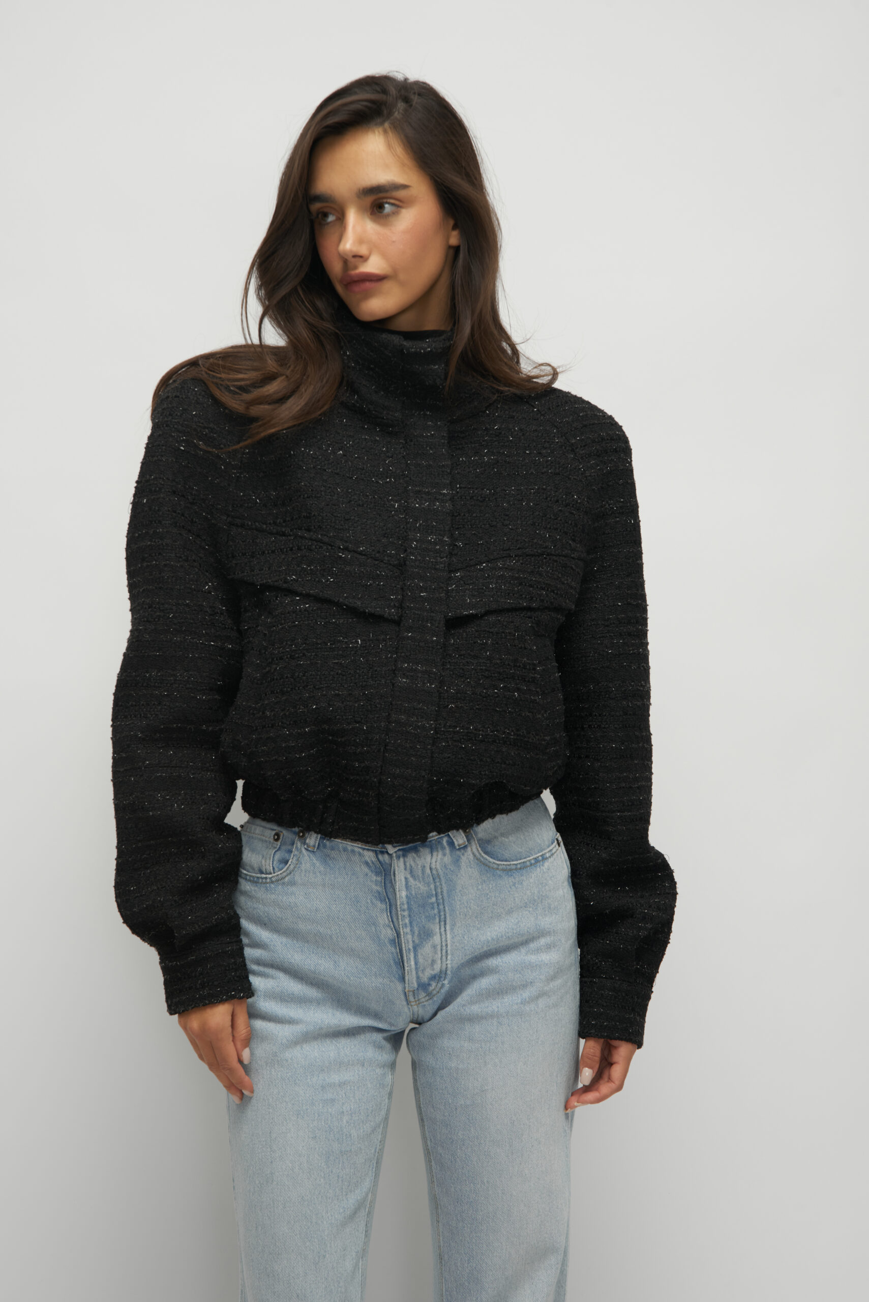 Kurtka o oversizowym kroju z poduszkami na ramionach o zaokrąglonym kształcie wykonana z tkaniny w kolorze czarnym z przeszyciami ze srebrnej nitki.