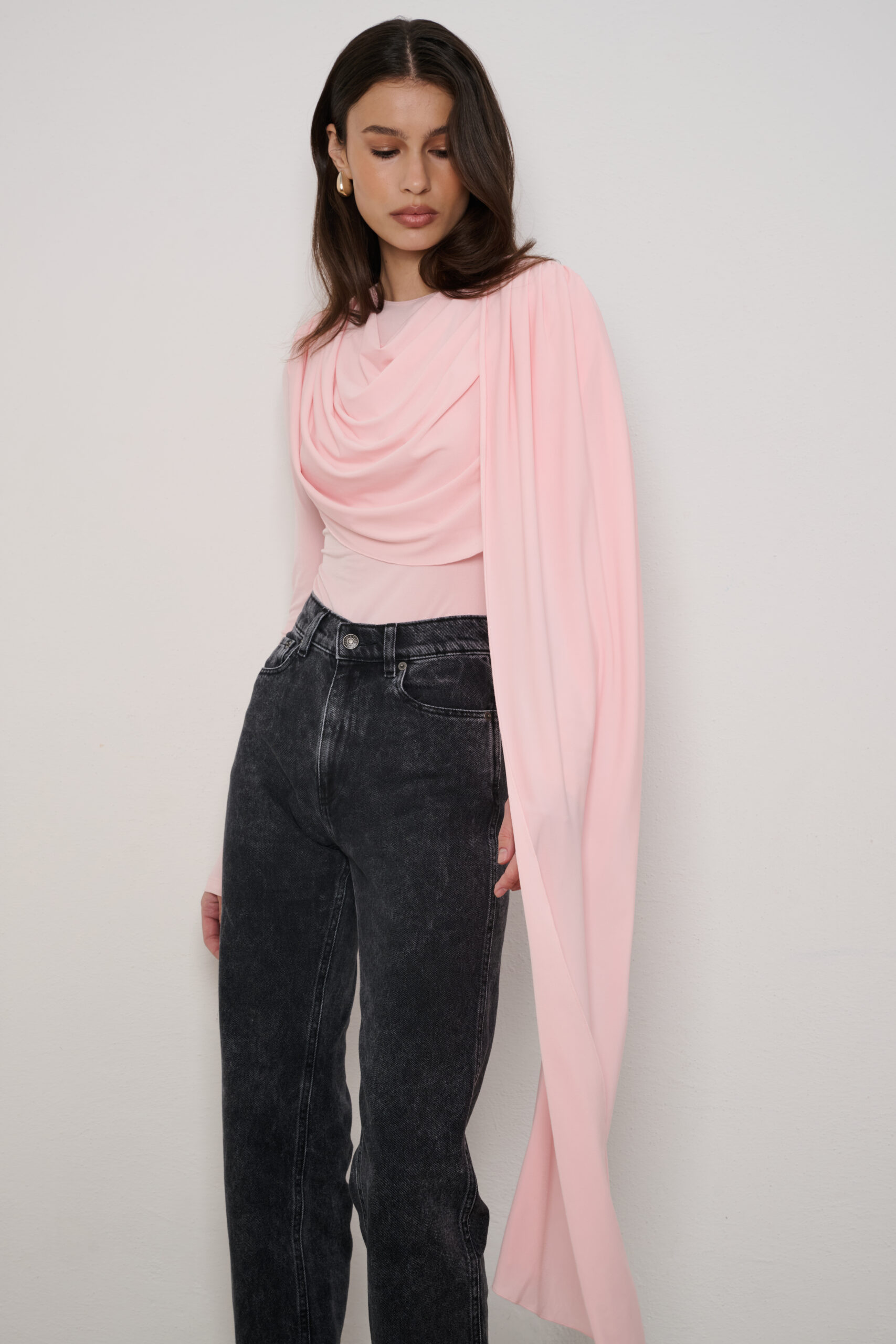 Fitted bodysuit with draping at the neckline and a striking sash over one shoulder. Made from stretchy, comfortable knit fabric. It subtly creates an elegant yet feminine silhouette.