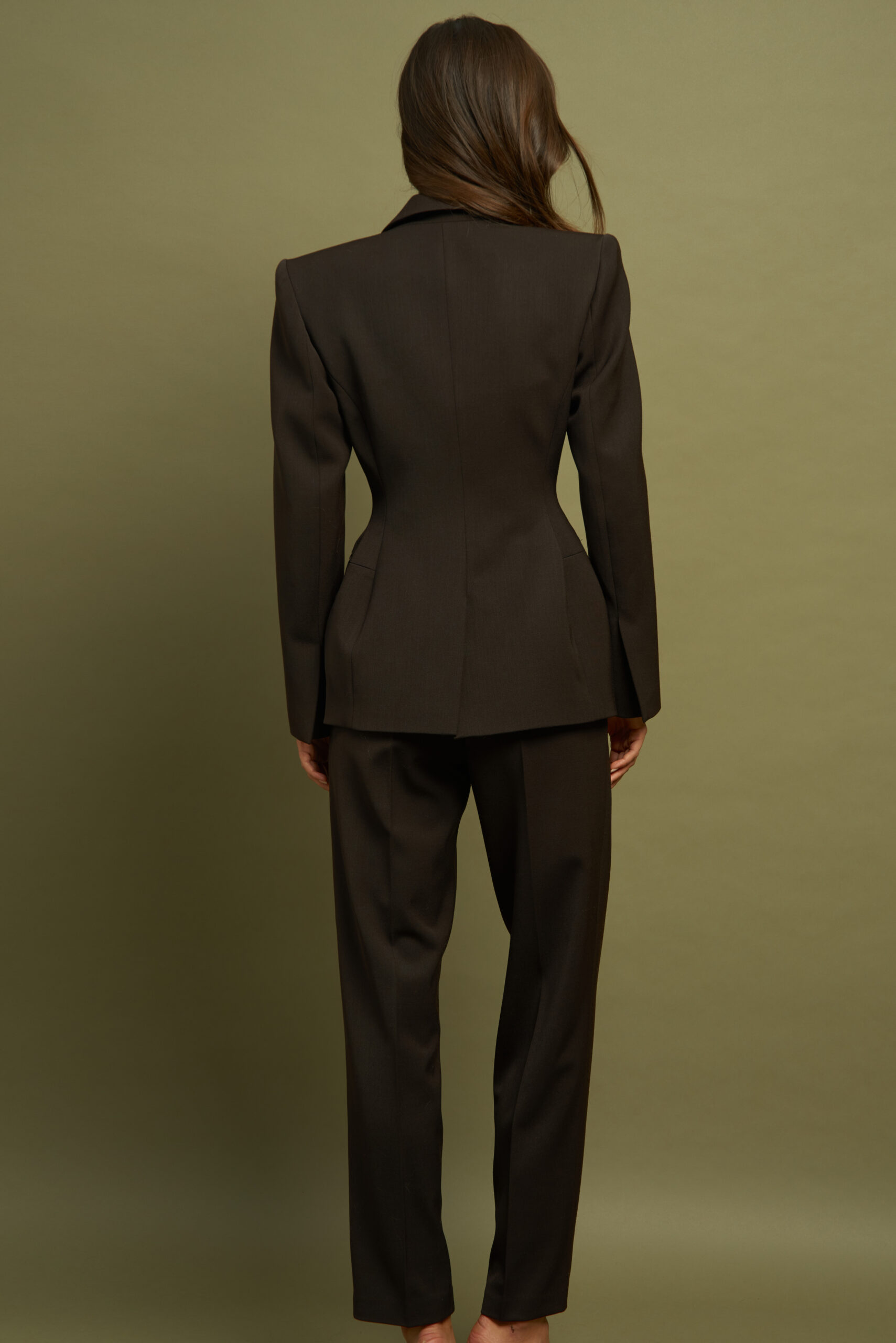 Taliowana marynarka z kieszaniami z przodu w kolorze ciemnego brązu. Zapinana na trzy logowane guziki.