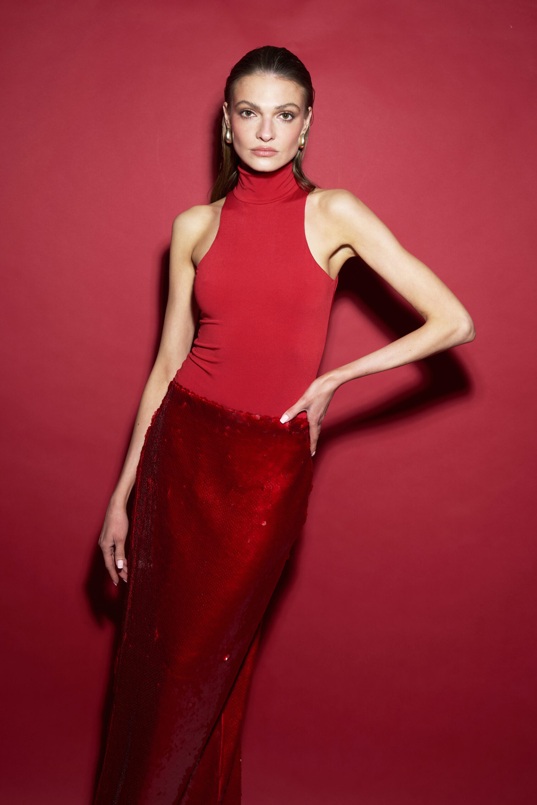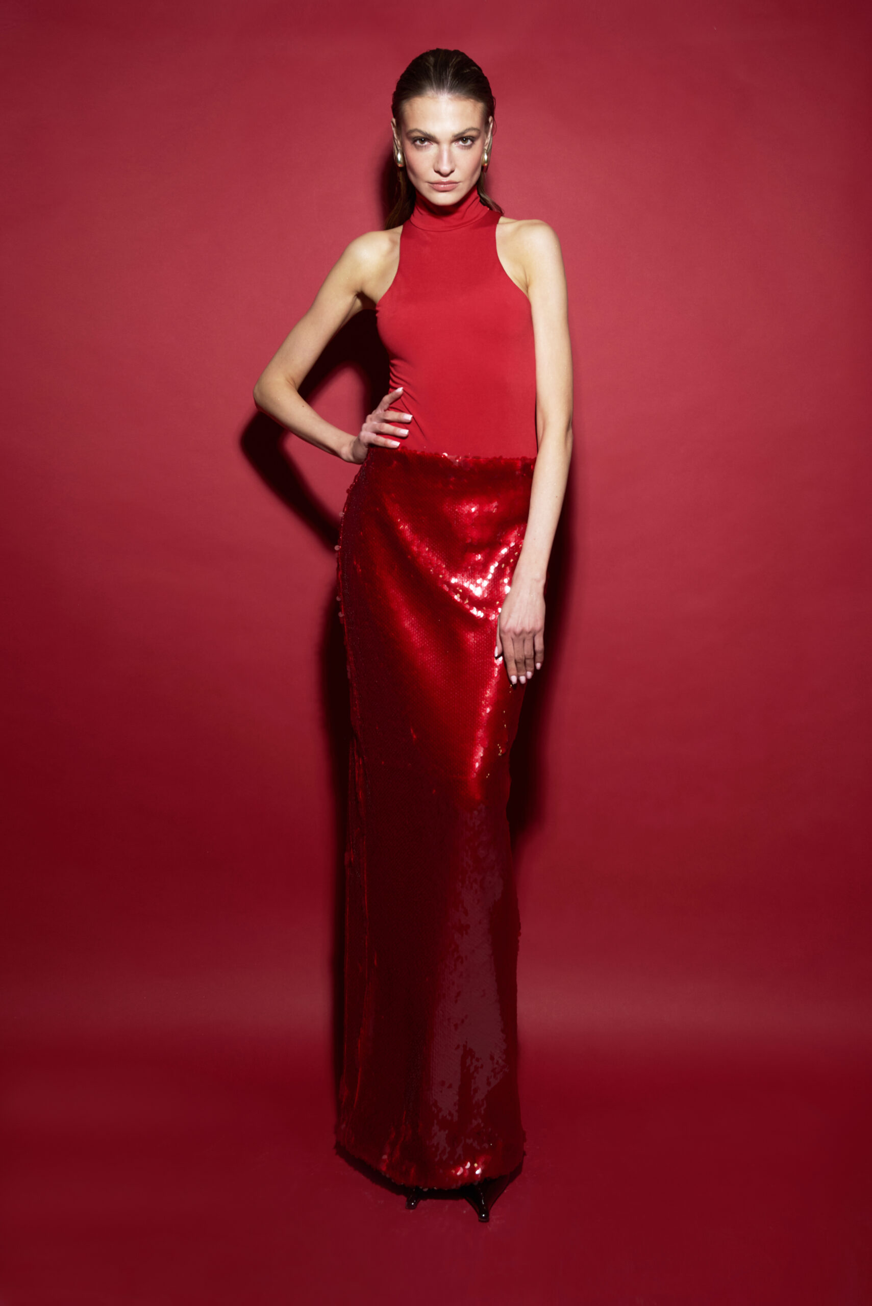 Cekinowa spódnica o prostym kroju i długości maxi w kolorze czerwonym.