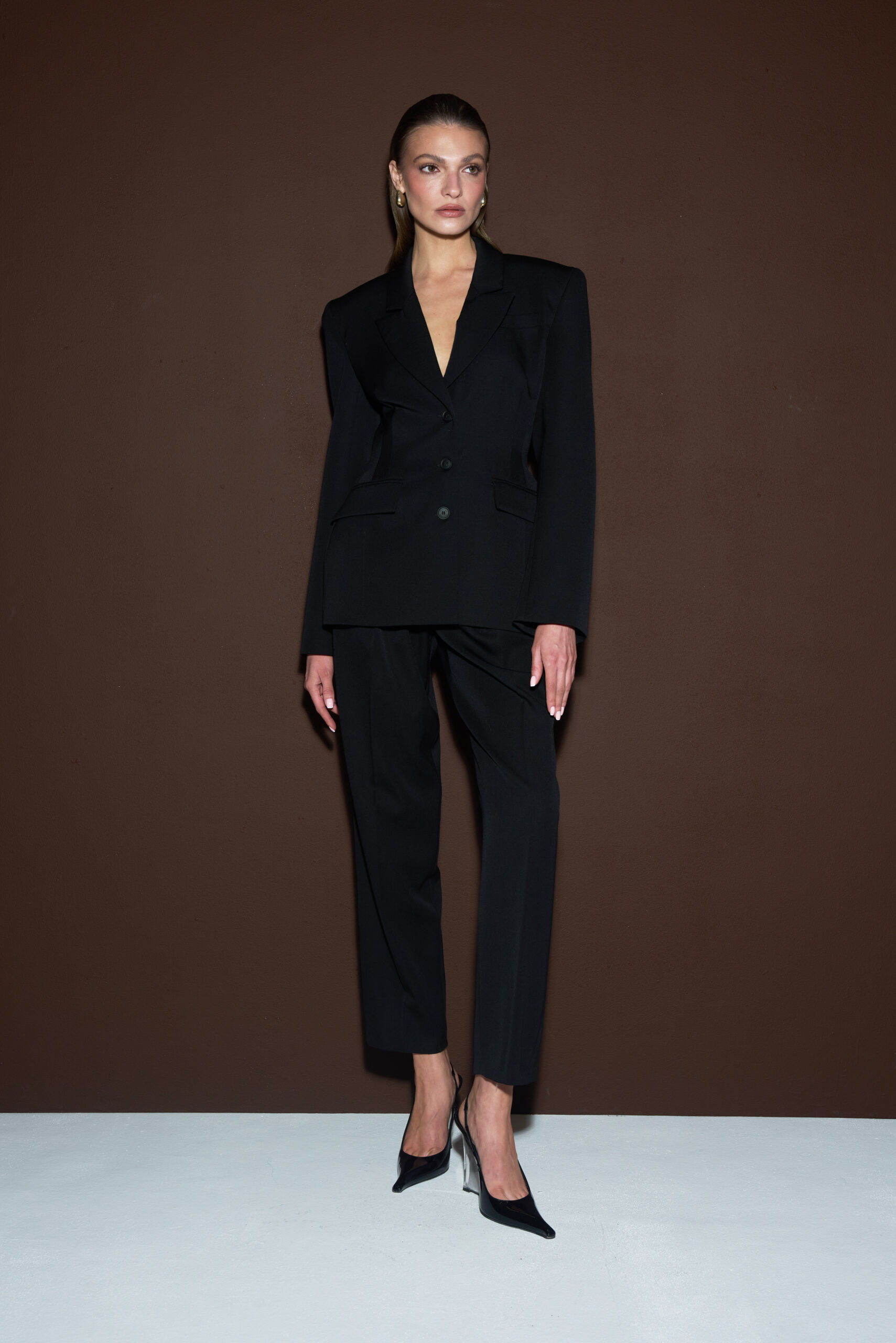 Garniturowe spodnie o zwężonym kroju nogawki w kolorze czarnym. Zapinane na logowany guzik. Noś z marynarką San Luis Black, aby stworzyć idealną stylizację.
