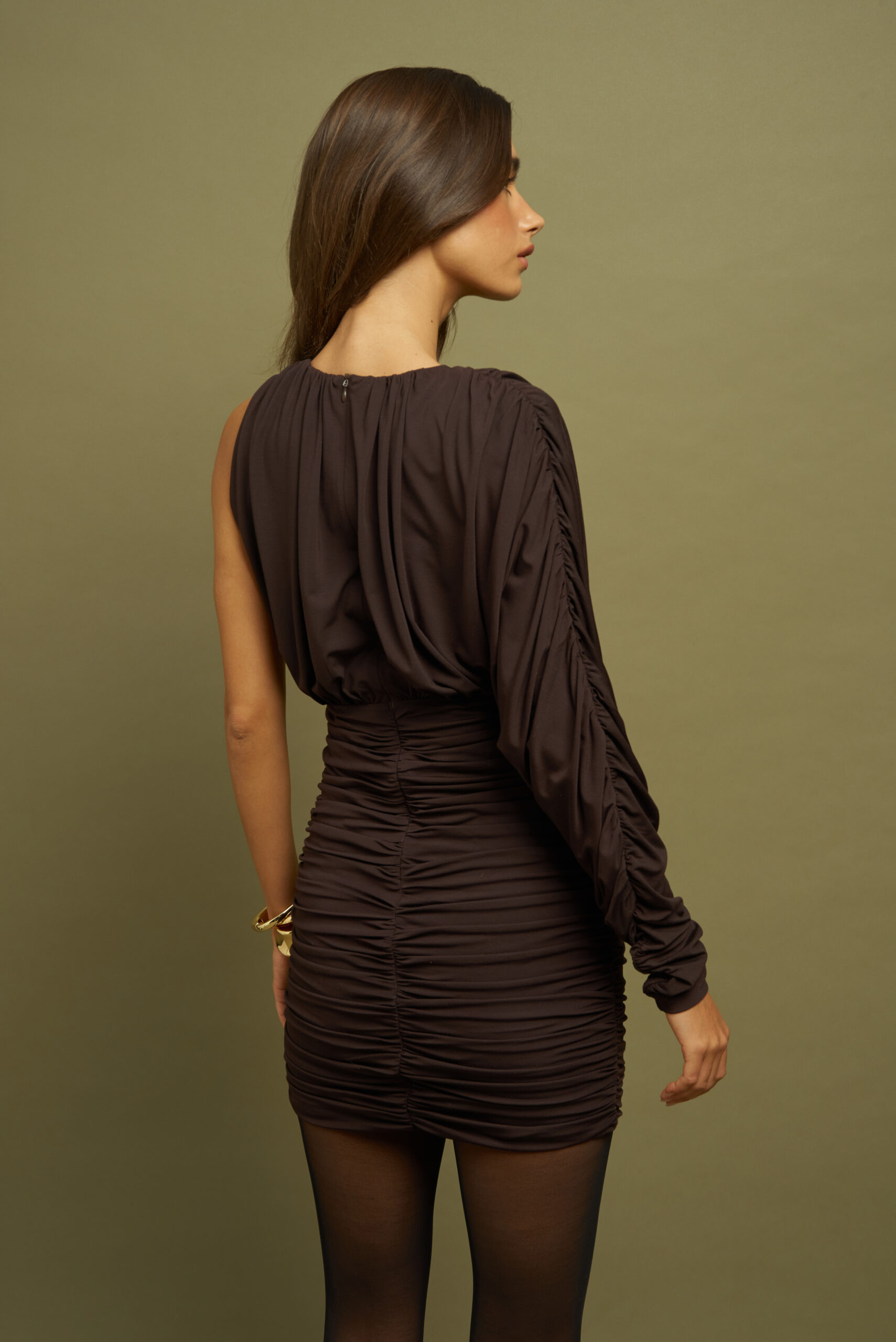Sukienka Geneva to model o dopasowanym kroju z efektownym drapowaniem i asymetrycznym rękawem. Wykonana z elastycznego materiału, który idealnie układa się na sylwetce. Świetna propozycja na wieczorne wyjścia.