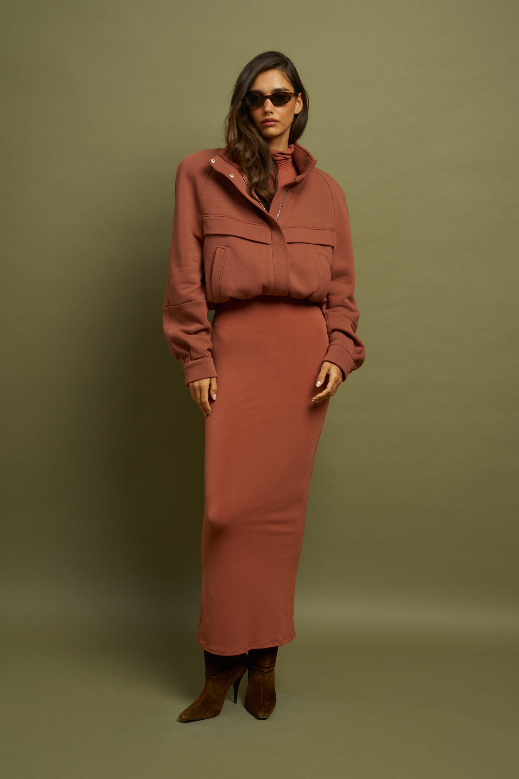 Milano to elegancka sukienka maxi o dopasowanym kroju, wykonana z miękkiej i elastycznej dzianiny. Golf i brak rękawów nadają jej nowoczesnego charakteru, a klasyczna kolorystyka sprawia, że to idealna baza do stylizacji wieczorowych i minimalistycznych looków. Podkreśla sylwetkę, zachowując przy tym pełen komfort noszenia.